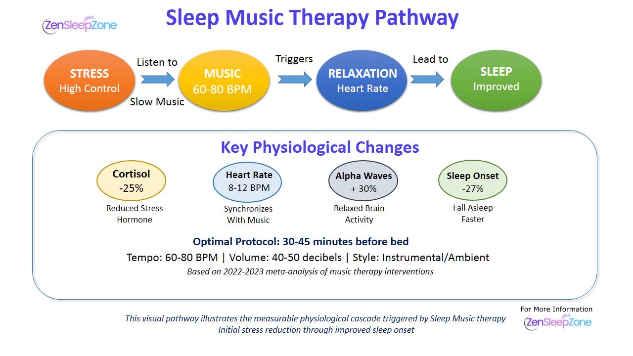 Sleep music therapy offers a simple, science-backed way to break the stress-insomnia cycle and fall asleep faster. The sleep music therapy pathway starts with high-control stress and ends with improved sleep — all triggered by listening to slow music at 60-80 BPM. This article explains the visual pathway from the official ZenSleepZone infographic, the exact physiological changes involved, and the optimal protocol proven by 2022-2023 meta-analyses of music therapy interventions.