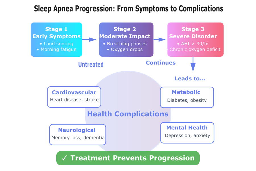 - Severe: Very loud snoring, frequent gasping/choking at night, extreme fatigue, memory issues, high blood pressure, depression risk.